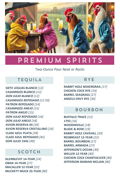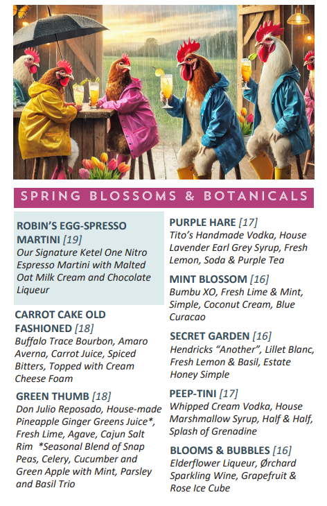 Don Julio Reposado, House-made Pineapple Ginger Greens Juice*, Fresh Lime, Agave, Cajun Salt Rim *Seasonal Blend of Snap Peas, Celery, Cucumber and Green Apple with Mint, Parsley and Basil Trio